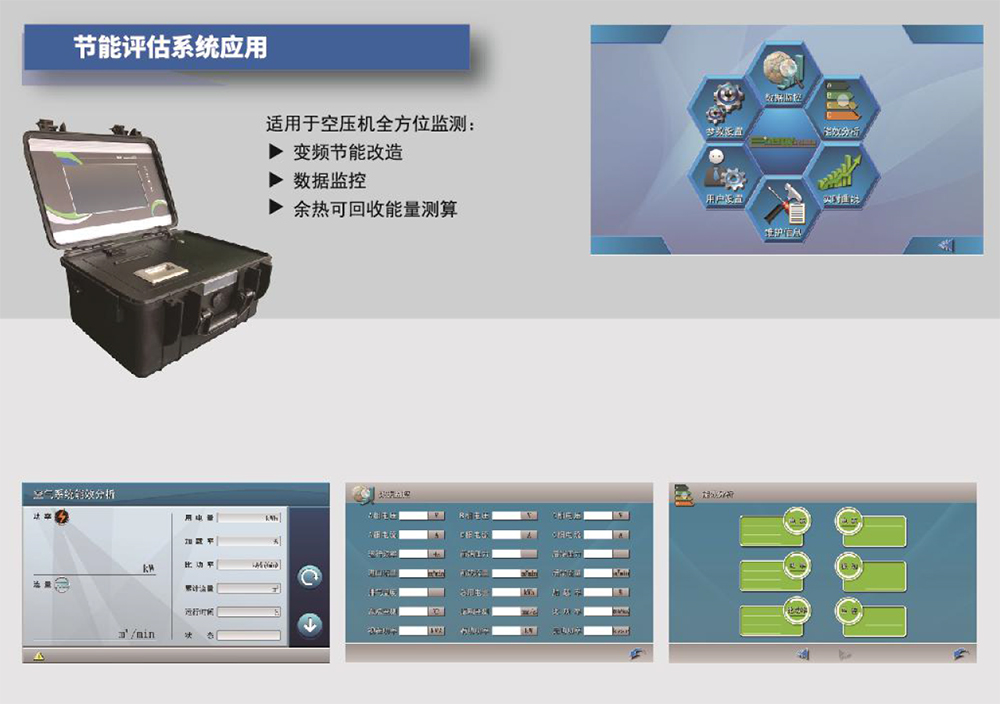 節(jié)能評(píng)估系統(tǒng),該系統(tǒng)的檢測(cè)裝置可以對(duì)空壓機(jī)整機(jī)系統(tǒng)進(jìn)行運(yùn)行數(shù)據(jù)采集及節(jié)能空間的評(píng)估,對(duì)采集的數(shù)據(jù)進(jìn)行計(jì)算機(jī)全方位深度分析,獲取現(xiàn)有壓縮機(jī)的加/卸載情況和壓縮空氣系統(tǒng)的全面信息,明確節(jié)能空間和節(jié)能潛力,幫助企業(yè)獲得更準(zhǔn)確的節(jié)能依據(jù)以便于未來的投資決策。