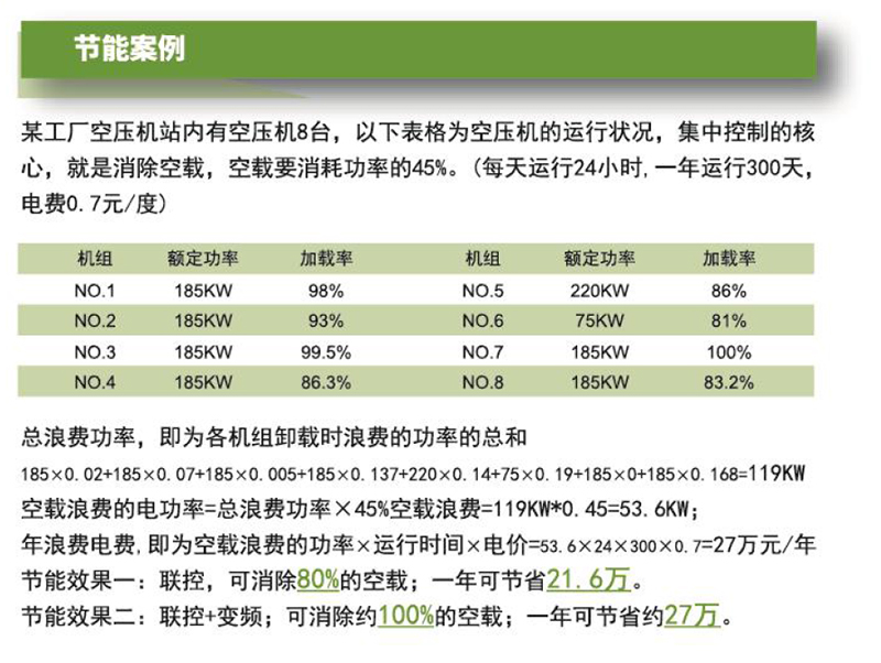 該系統能實現多臺空壓機無人值守連鎖控制(最多控制16臺) ;實現多臺機組順序啟停,輪流值守,主副機定時切換、變頻機組先起后停及對各機組運行參數進行監控與按需設置,從而達到提高工作效率、安全運行及充分節能的目的,并實現能量監控。
